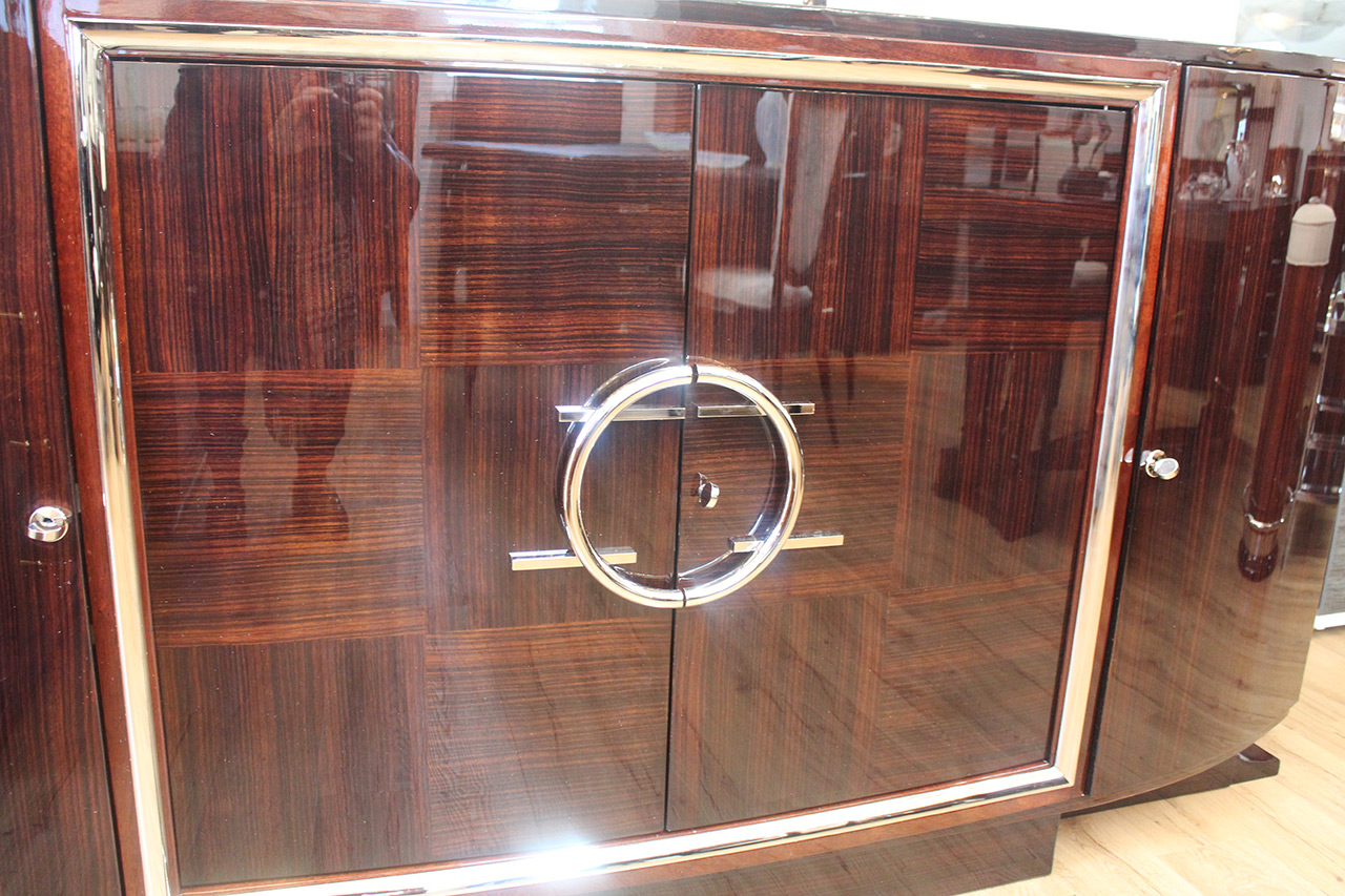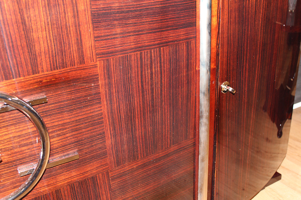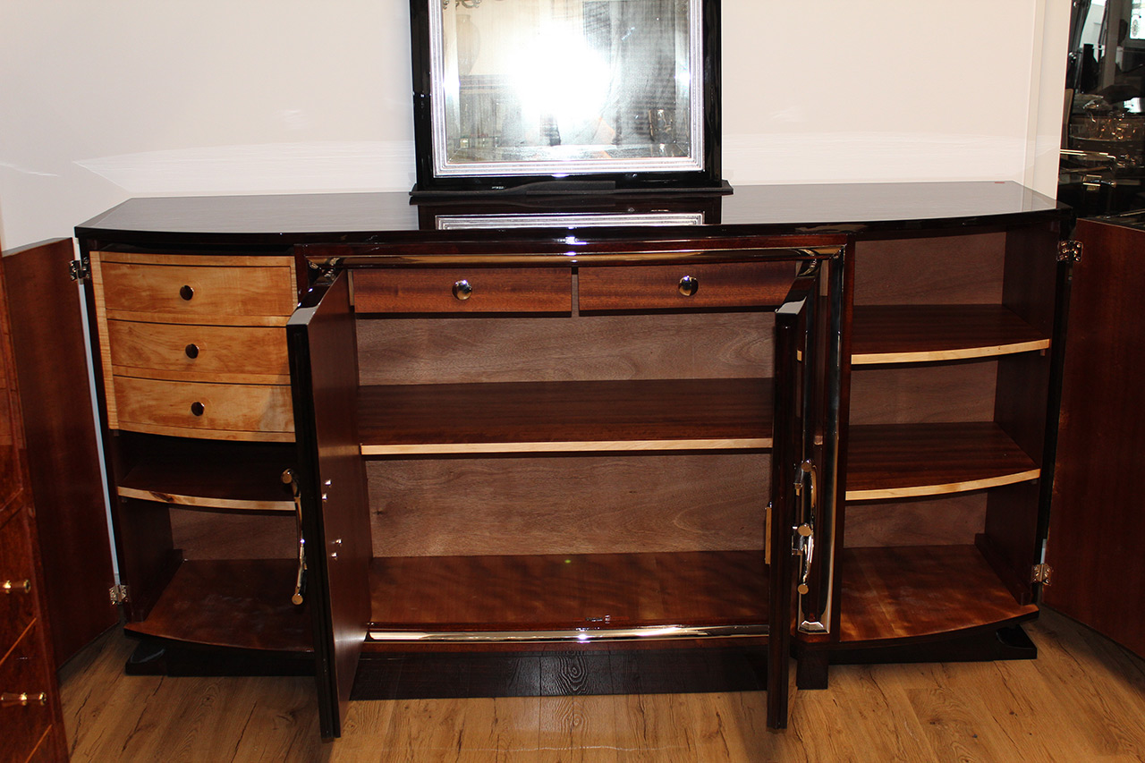 Exklusives hochwertiges Sideboard in feinstem Palisander, Maxime Old zugeschrieben, Inneneinteilung mit vier Einlegeböden und fünf Schubladen, drei Schubladen mit original Besteckkasteneinsatz in perfektem Zustand, alle Messingteile vernickelt