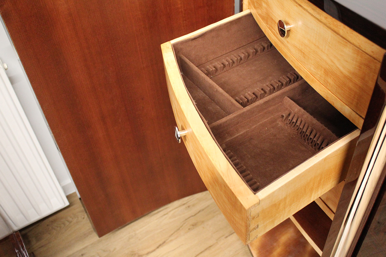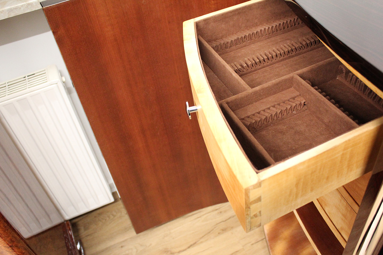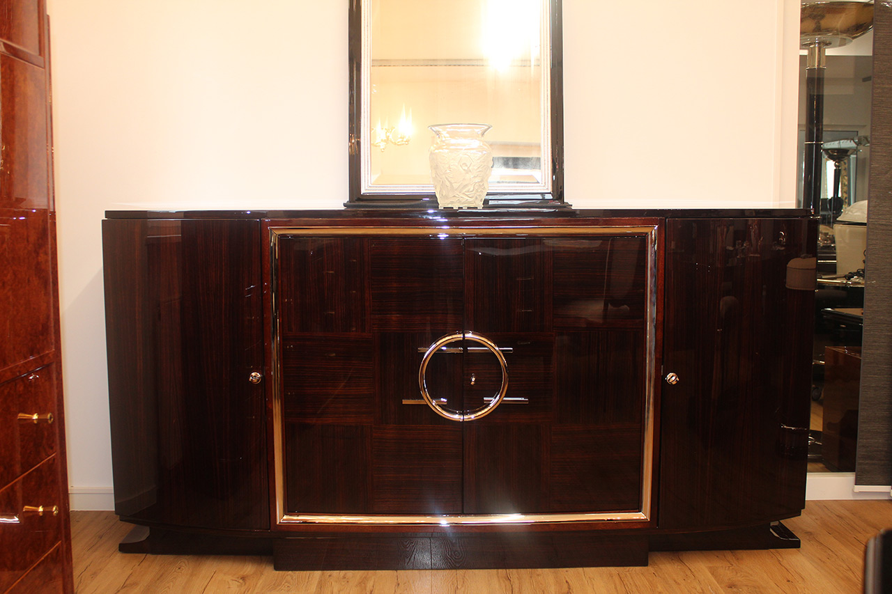 Exklusives hochwertiges Sideboard in feinstem Palisander, Maxime Old zugeschrieben, Inneneinteilung mit vier Einlegeböden und fünf Schubladen, drei Schubladen mit original Besteckkasteneinsatz in perfektem Zustand, alle Messingteile vernickelt