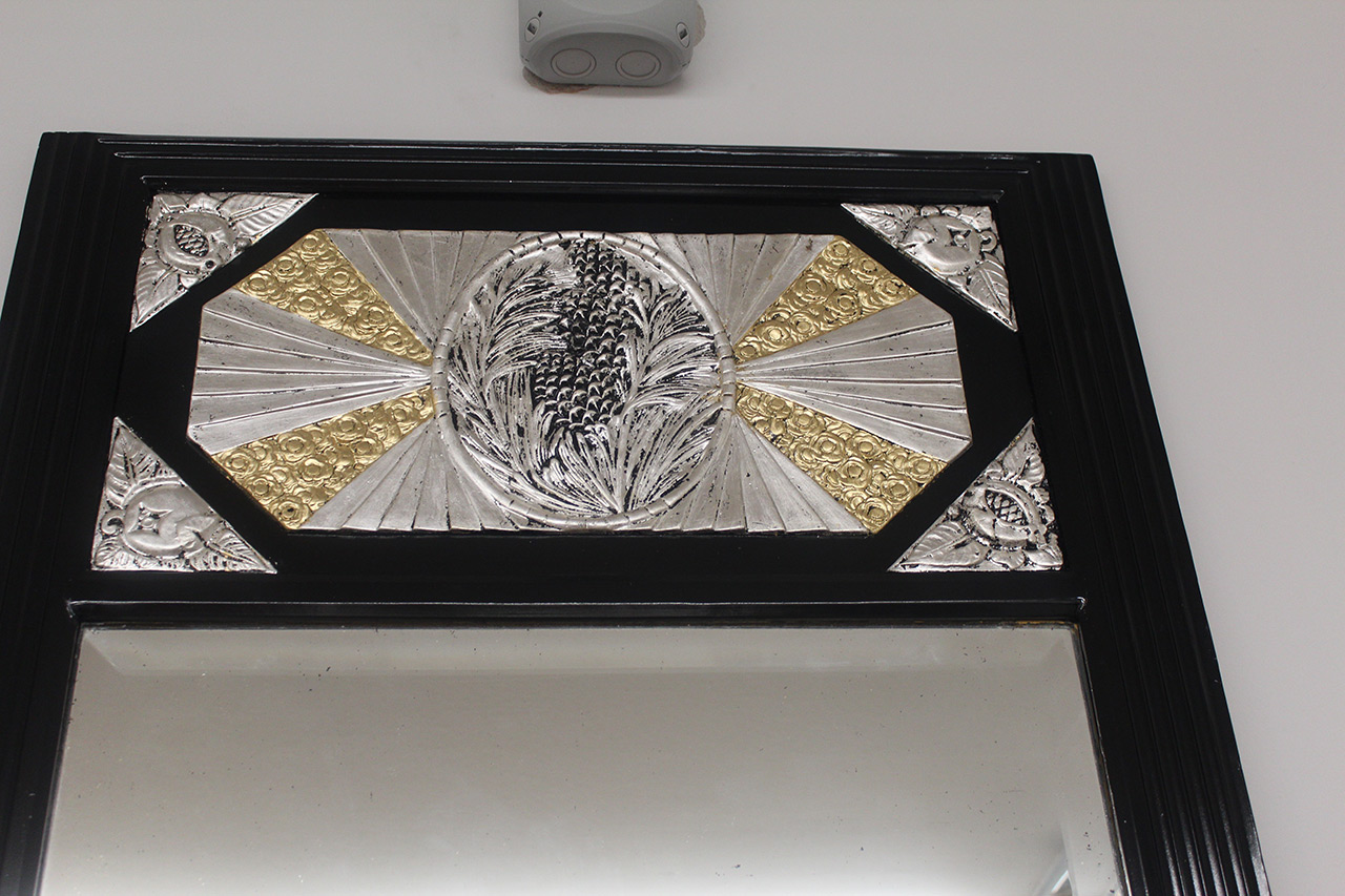 Spiegel, Schellack, silberne und goldene stilisierte florale Motive