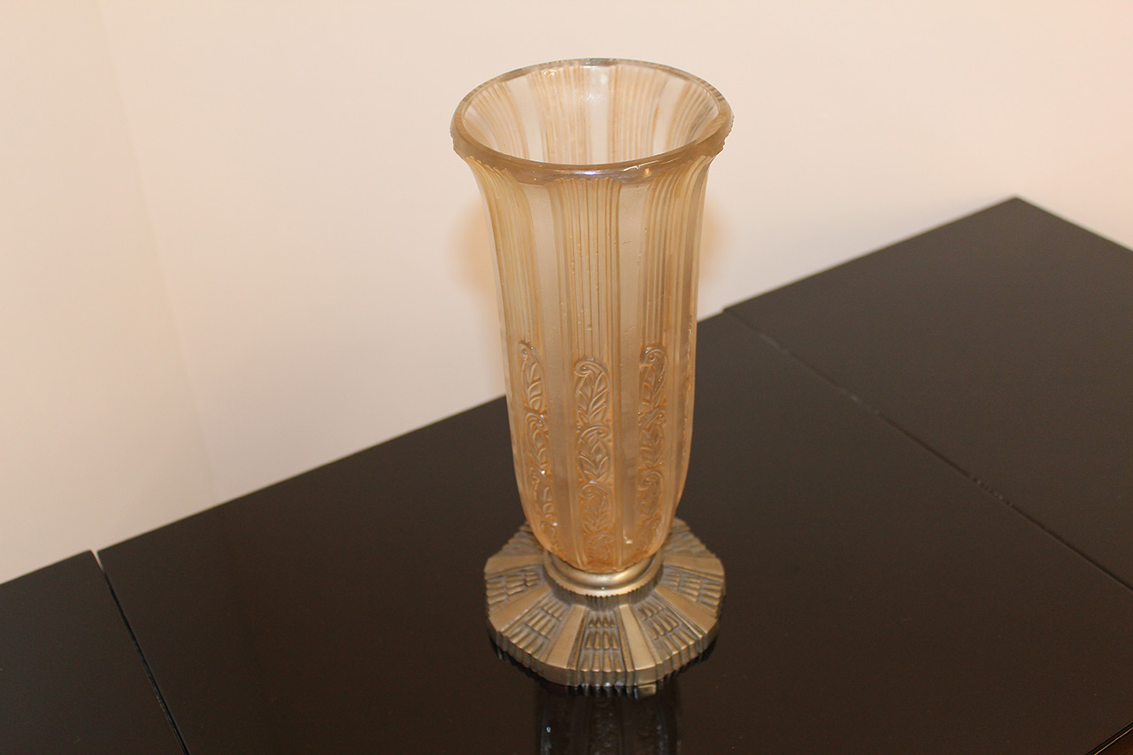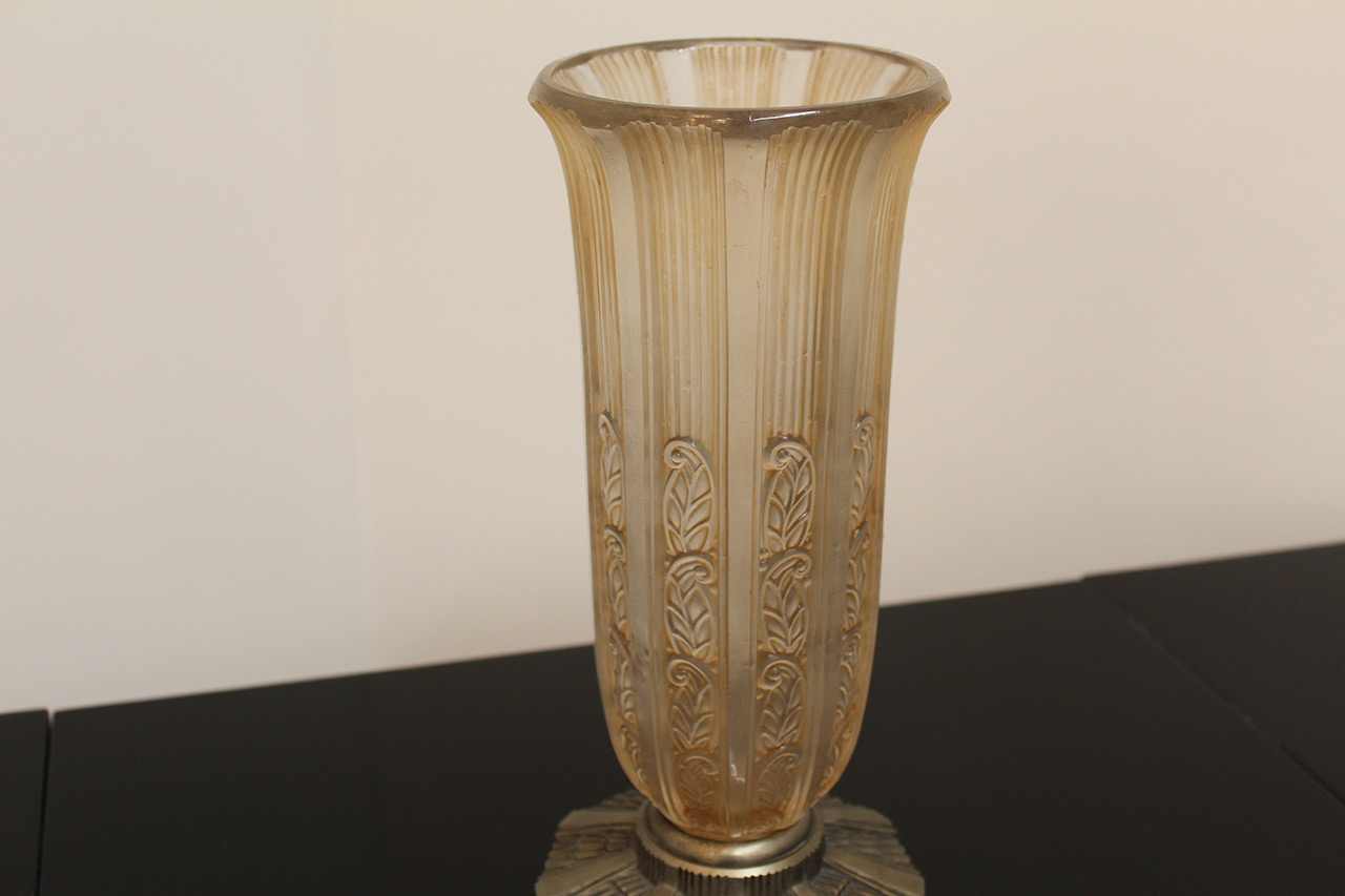 Glasvase von Hettier & Vincent mit stilisierten Blattmotiven auf einem Bronzesockel